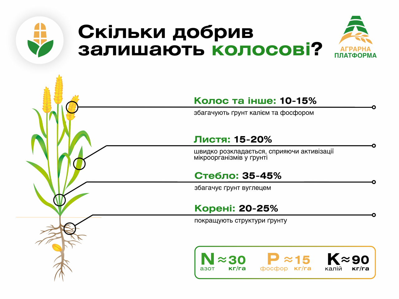 - Калій, який виділяється з решток, швидко стає доступним для наступних культур, особливо на легких ґрунтах.