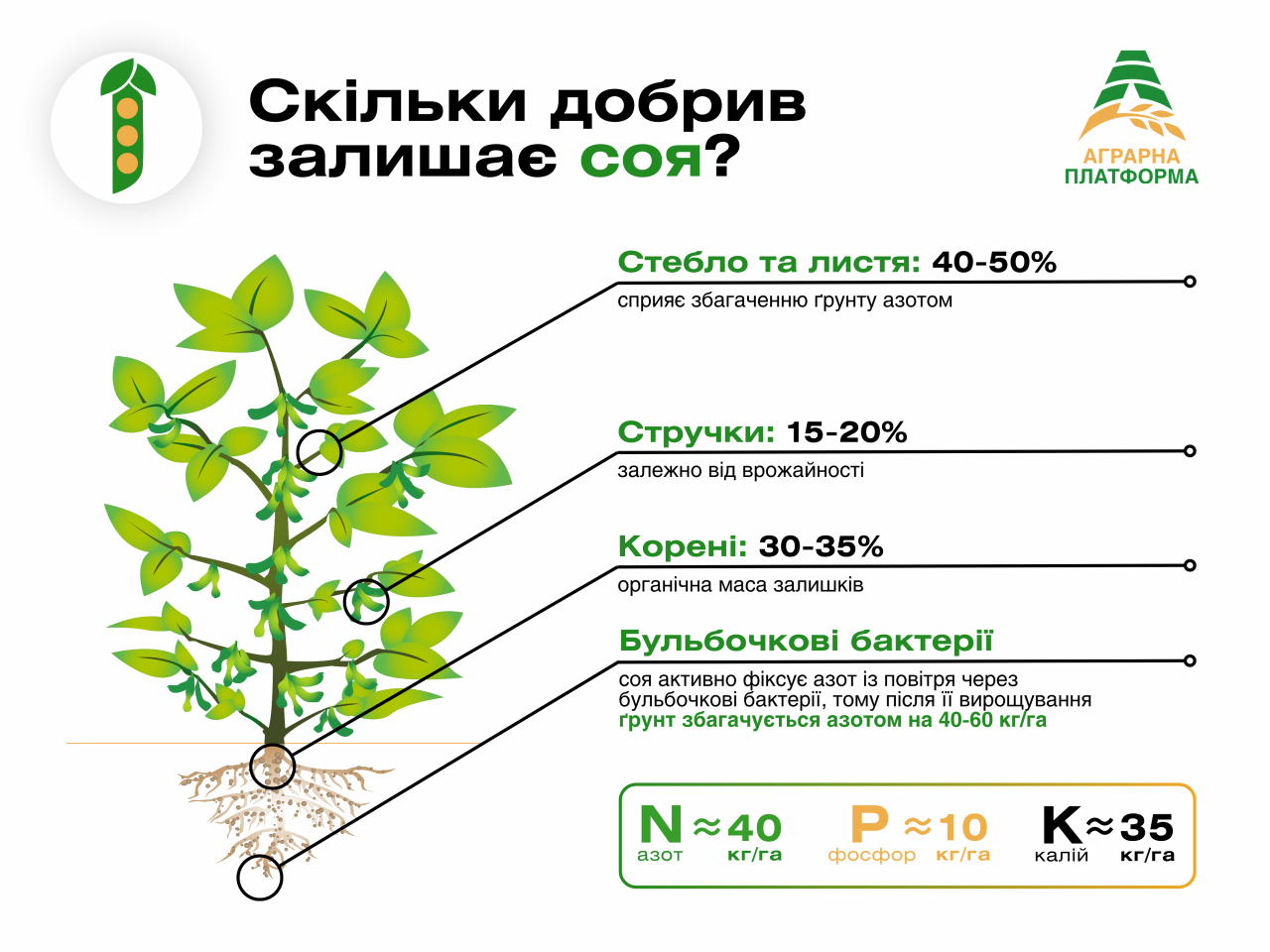 Соя є бобовою культурою, яка відома здатністю збагачувати ґрунт азотом завдяки симбіозу з бульбочковими бактеріями. Завдяки цьому вона залишає у ґрунті значну кількість азоту, що є ключовою перевагою для наступних культур.