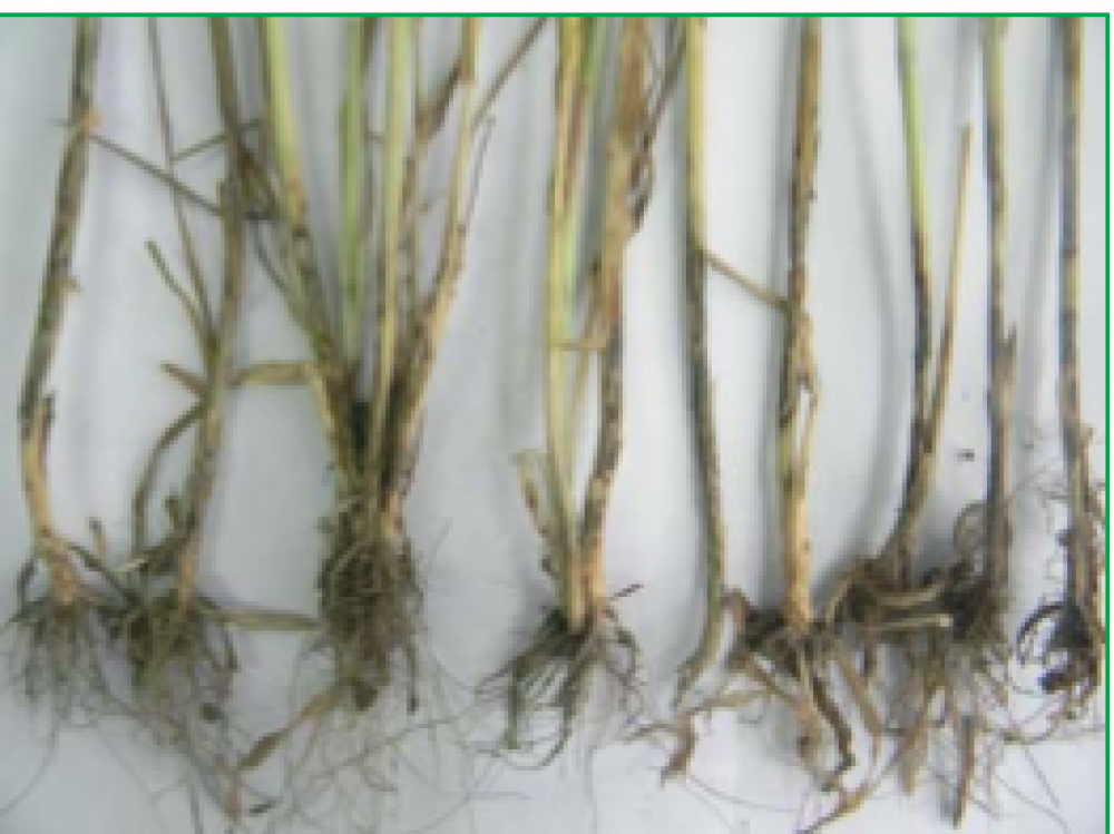 На ранніх етапах на листях і стеблах з'являються характерні плями, які згодом поширюються, повністю охоплюючи стебло. Уражені ділянки втрачають міцність, що призводить до ламкості та безладного вилягання рослин. За сприятливих умов розвитку гриба, на міцелії формуються дрібні чорні склероції, які є додатковими векторами зараження.