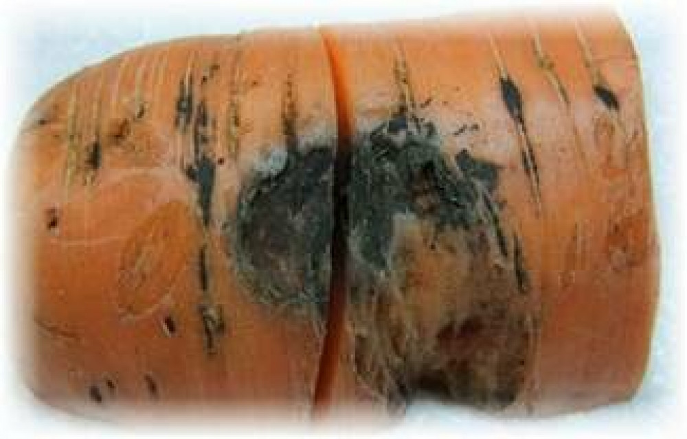 Інфекція вражає сходи, дорослі рослини, а також коренеплоди під час зберігання. Ураження відбувається через ранки, нанесені під час копання та перевезення моркви. На коренеплодах (збоку або на верхівці) утворюються сухі вдавлені плями. При розрізі на місці утворення плями видно вугільно-чорне забарвлення ураженої тканини. На насінниках, уражених чорною гниллю, стебла та суцвіття в’януть, урожай насіння зменшується. При зберіганні моркви хвороба розвивається повільно, великої шкоди не завдає.