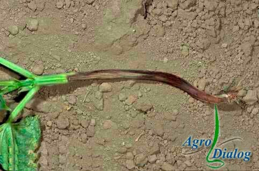 Також спостерігається руйнування кори біля кореневої шийки та на коренях, що призводить до її відшарування і оголення деревини. Висушені рослини з потемнілими рештками зруйнованих коренів легко витягуються з грунту. На перерізі кореневої шийки видно побурілу тканину, усіяну майже чорними склероціями, які є зимуючою стадією гриба. Цей гриб активно діє протягом усього періоду від цвітіння до кінця вегетації.