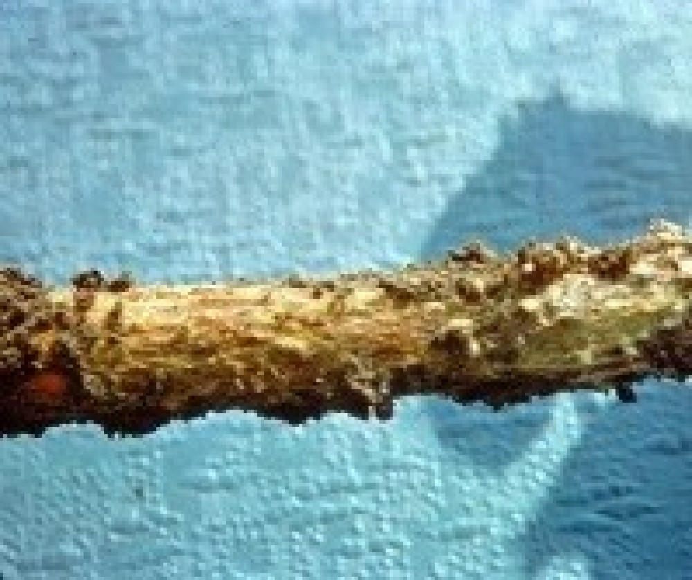 Гриб формує на поверхні ураженої рослинної тканини склероції неправильної форми, що мають коричневий або чорний колір, з діаметром від 1 до 5 мм. У пошкоджених органах гриб також виробляє конідіальне спороношення на поверхні ґрунту навколо відмерлих рослин. Конідії майже безбарвні, одноклітинні, мають кулясту форму з діаметром 4,8-5,5 мкм, а міцелій характеризується "голчастою" структурою.