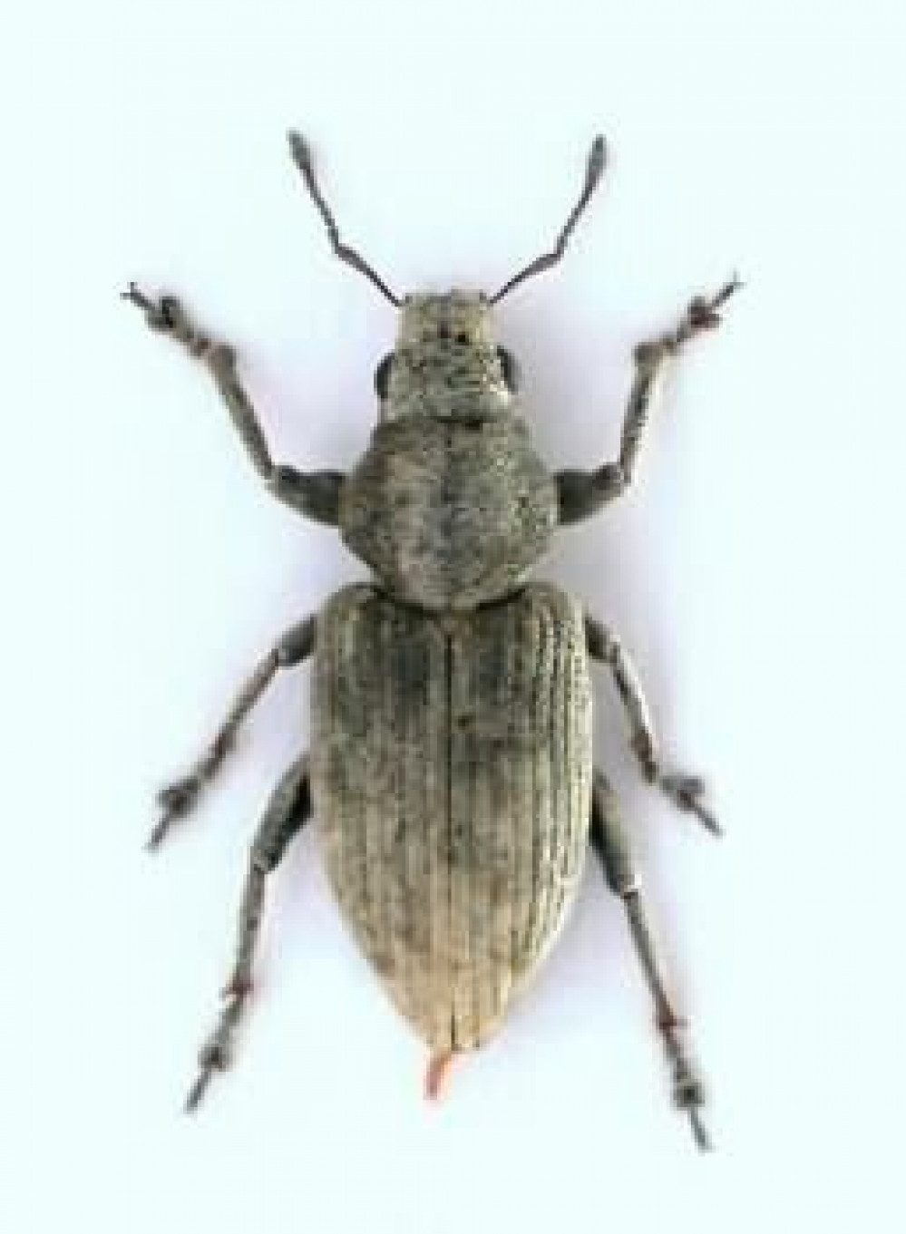- Жук: розміром 6,5 – 8 мм, чорний, густо вкритий сірими волоскоподібними лусочками. Зовні дуже схожий на сірого бурякового довгоносика, але має розвинене крило.