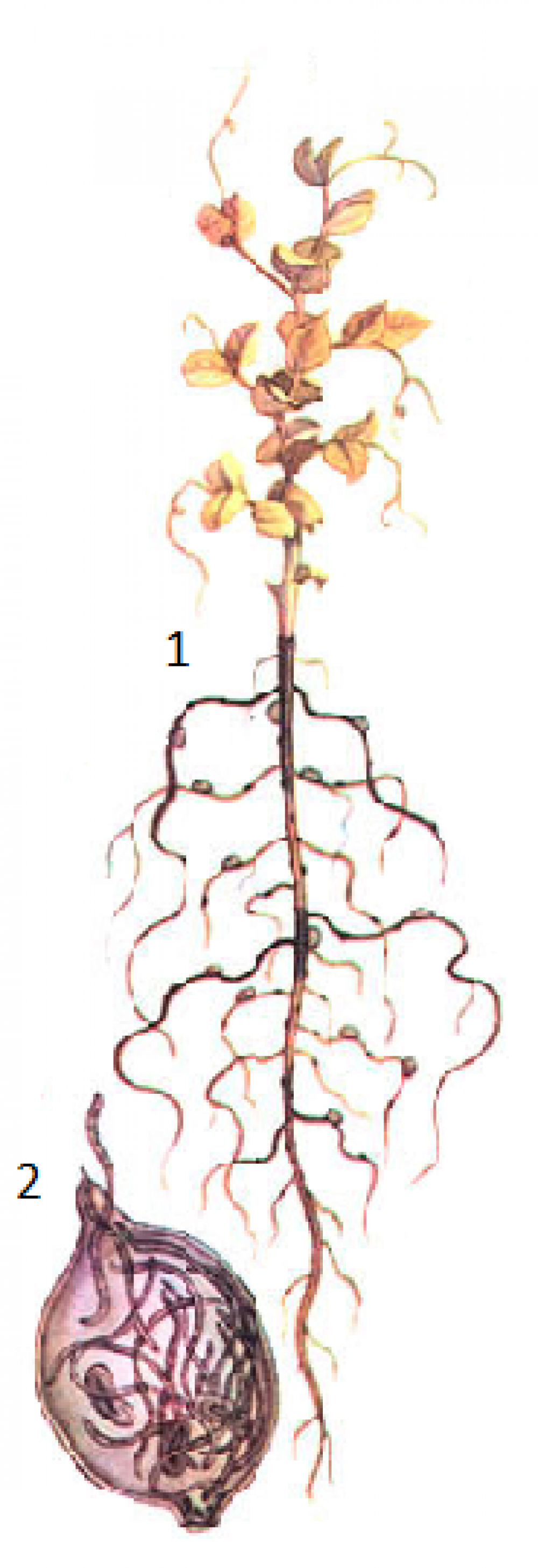 Ця нематода викликає пошкодження гороху, вики, чини, сочевиці та люпину. Уражені рослини часто мають карликовий вигляд, відстають у рості, їх листя жовтіє та передчасно відмирає. На коріннях рослин спостерігається коренева гниль, вони стають тонкими, в'ялими та мало розгалуженими. Сильно уражені рослини можуть повністю в'янути та відмирати.