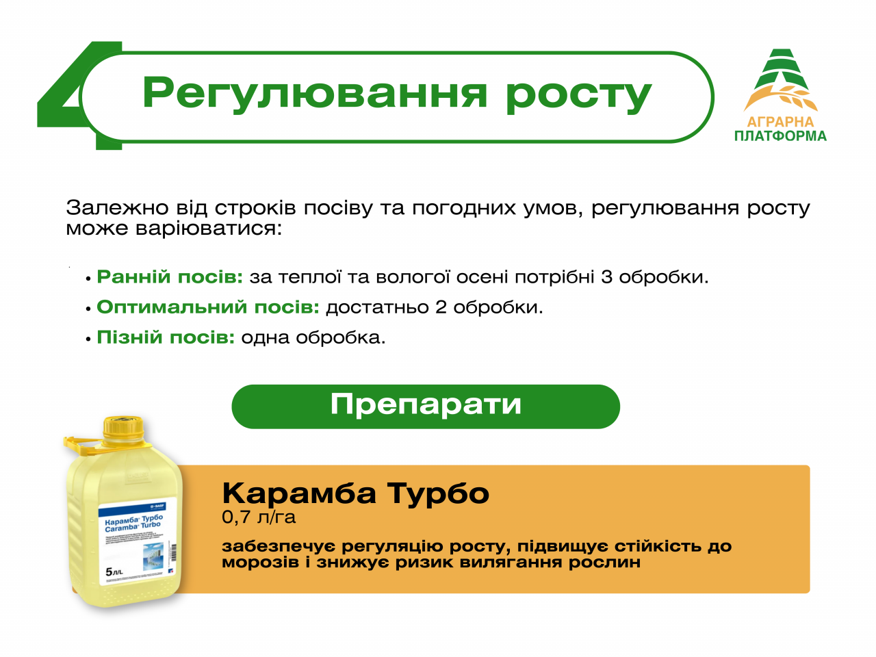 | Карамба Турбо – обеспечивает равномерный рост, укрепляет корневую систему, повышает морозостойкость и снижает риск полегания. | 0,7 л/га |