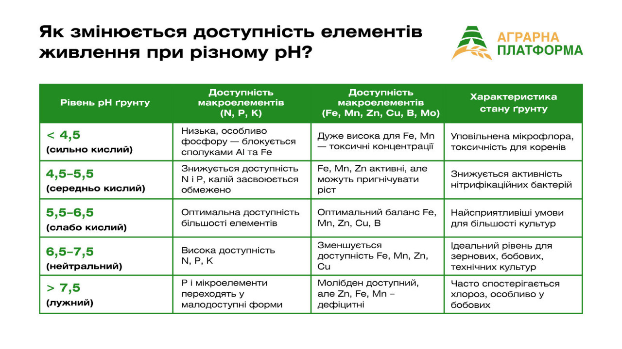 Большинство сельскохозяйственных культур лучше всего растут при pH 6,0 – 7,0. Если кислотность ниже, усвоение основных элементов питания (азота, фосфора, калия, кальция, магния) резко уменьшается, а фосфор переходит в недоступные формы.