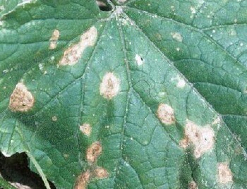 - Листья: На листьях растений появляются большие желтоватые, выпукло-угловатые пятна. В условиях повышенной влажности на жилках развивается розовый налет от скопления спор гриба. Пятна быстро увеличиваются в размерах, ткань высыхает и выпадает, образуя щелевидные отверстия.