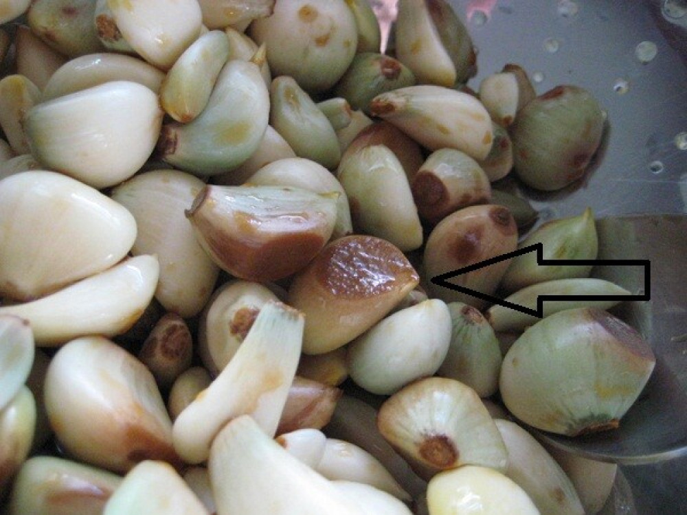 Бактерии Erwinia carotovora (и другие родственные виды), которые попадают в растения из-за повреждений. Кроме чеснока поражает другие овощные культуры. Характерные признаки бактериальной гнили включают мягкие, влажные, кремовые до бежевого цвета провалы в тканях, окруженные темно-коричневым или черным кольцом. Зубчики уменьшаются, заполняются жидкостью и при нажатии проваливаются. На месте горлышка выделяется жидкость с неприятным запахом.
