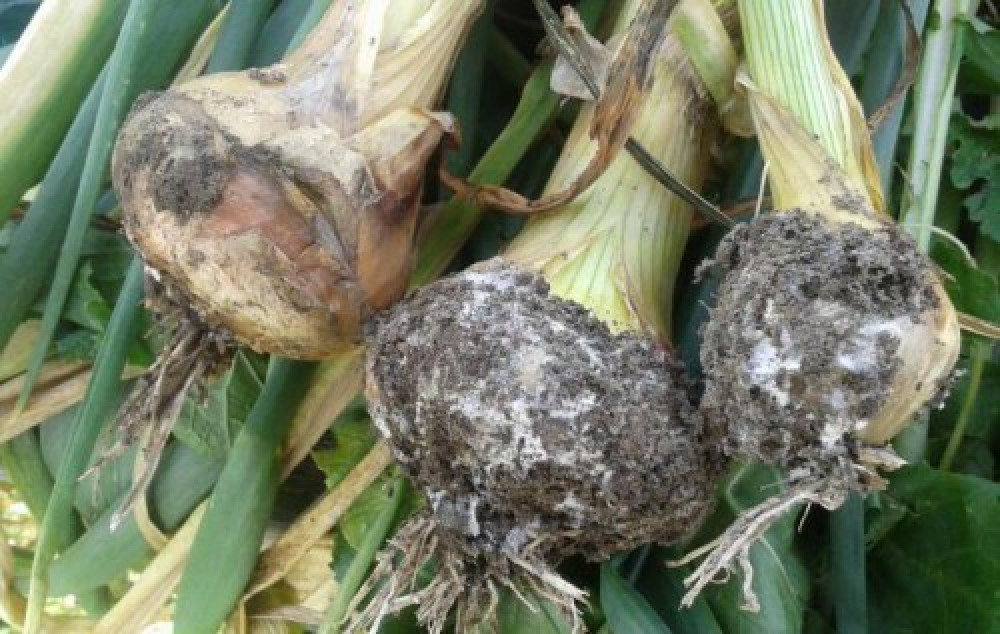 Первые признаки болезни включают пожелтение и отмирание листьев. Впоследствии отмирают корни, и растение погибает. На поверхности пораженной ткани появляется белый рыхлый налет грибницы, на котором образуются мелкие черные склероции гриба. Признаком заболевания является преждевременное отмирание листьев лука в конце вегетации, которое начинается с верхушки листа. На донышке луковицы появляется белый войлочный налет грибницы. Луковица становится мягкой, водянистой и загнивает. Заболевание продолжает развиваться в период зимнего хранения лука. Развитию болезни способствует повышенная температура почвы в период созревания лука, а также повреждение луковой мухой. Возбудитель долгое время может храниться в почве.