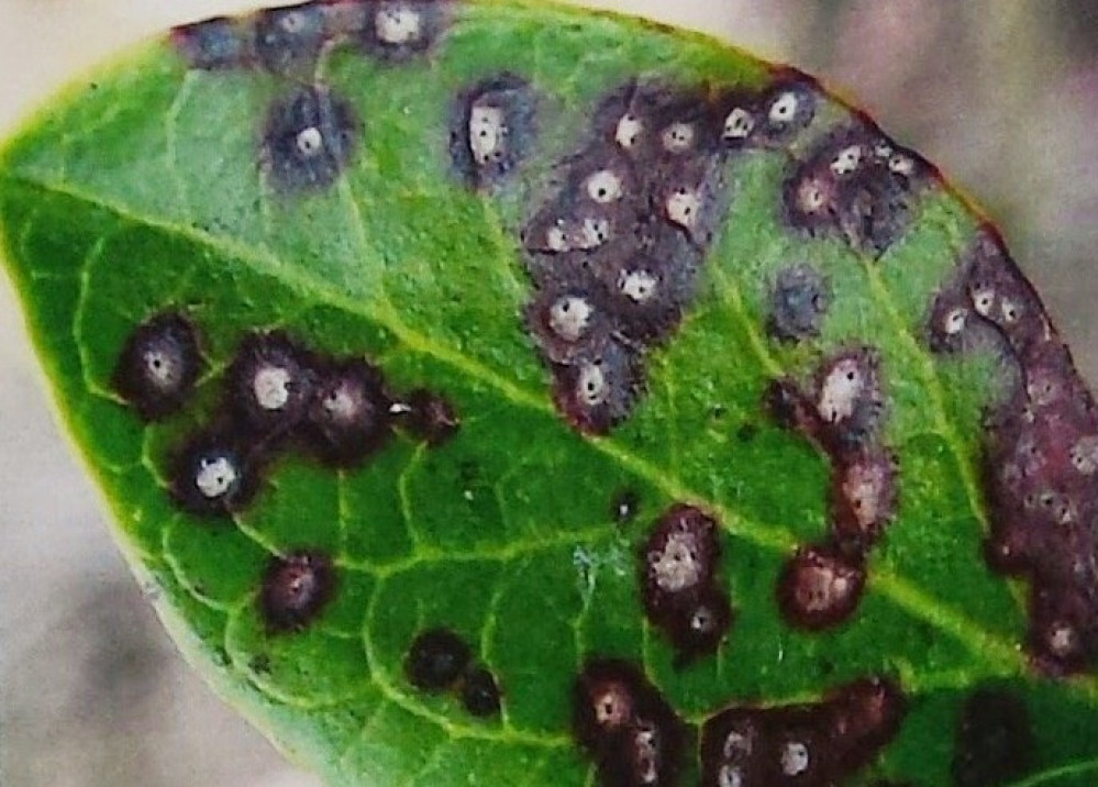 Эта болезнь, поражающая листья голубики, проявляется в виде округлых пятен, цвета которых колеблются от бело-серого до ржаво-коричневого с красноватым кантом. Листья, пораженные этой болезнью, увядают и опадают. Важной мерой профилактики является использование толстого слоя мульчи и очищение растений от больных листьев, которые следует сжечь.