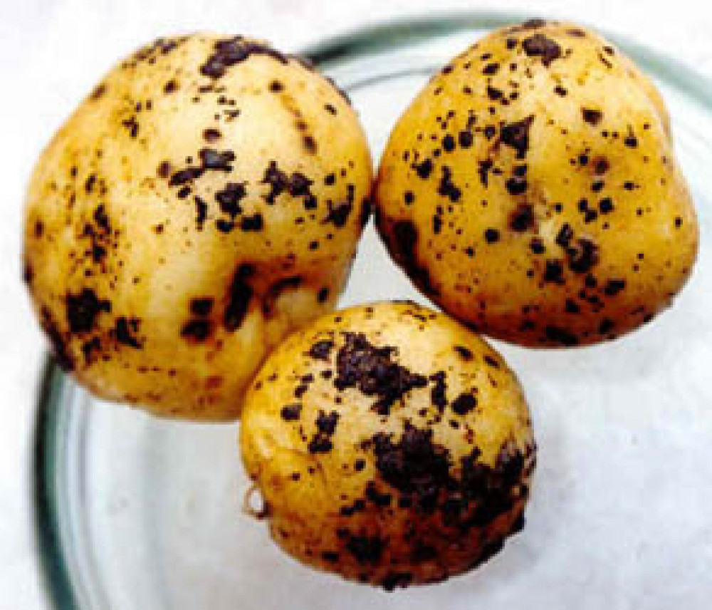 Черная парша картофеля является очень распространенным заболеванием, особенно наносит ущерб в Полесье Украины. Чаще всего поражаются клубни, стебли и корни взрослых растений. На поверхности клубней появляются твердые, черные, неправильно очерченные коростинки разной величины, напоминающие комочки прилипшей земли. На ростках и корнях наблюдаются бурые пятна и язвы величиной до 1 см и более, иногда появляется буроватая штриховатость. Пораженный участок отмирает. При микроскопическом исследовании кожицы клубня в месте прикрепления склероции видны красно-кирпичные гифы, находящиеся только в поверхностном слое пробковых клеток, а склероции формируются только на поверхности.