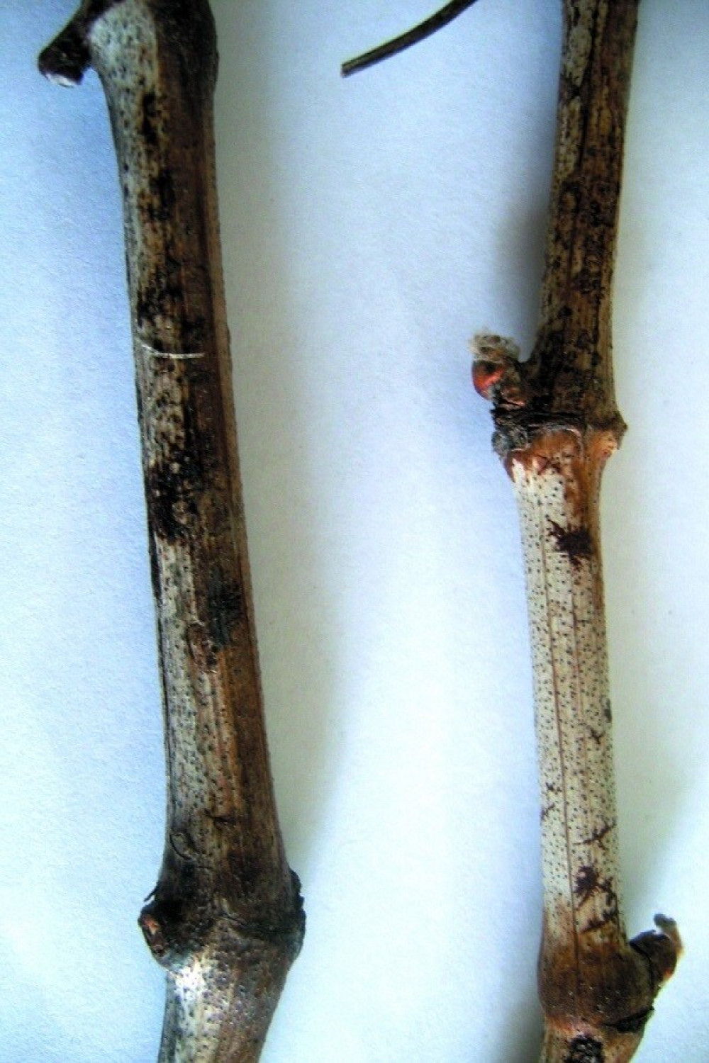 Первые симптомы черной пятнистости могут быть обнаружены в мае, когда виноград находится в фазе 2-3 листа. Затяжная весна может способствовать развитию заболевания здоровыми насаждениями. В июле на междоузлии появляются круглые некротические пятна, которые впоследствии могут слиться в одно крупное пятно, которое в итоге растрескивается. На нижних листьях формируются овальные некрозы, особенно под центральной жилкой, чернеющей вследствие заболевания. Иногда заражение достигает зрелых ягод, которые становятся темно-фиолетовыми и теряют вкусовые качества. На зрелой лозе и многолетней древесине образуются беловатые пятна.
