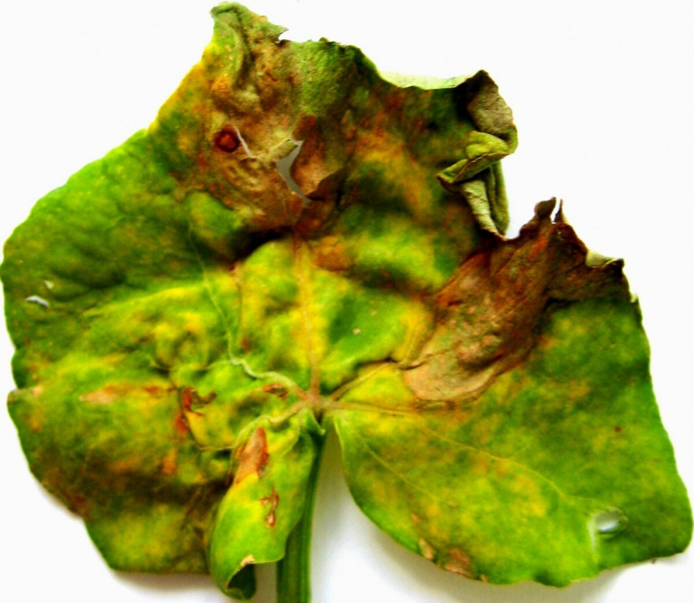 - В поздние фазы развития происходит побурение и отмирание листьев, цветков, плодов.