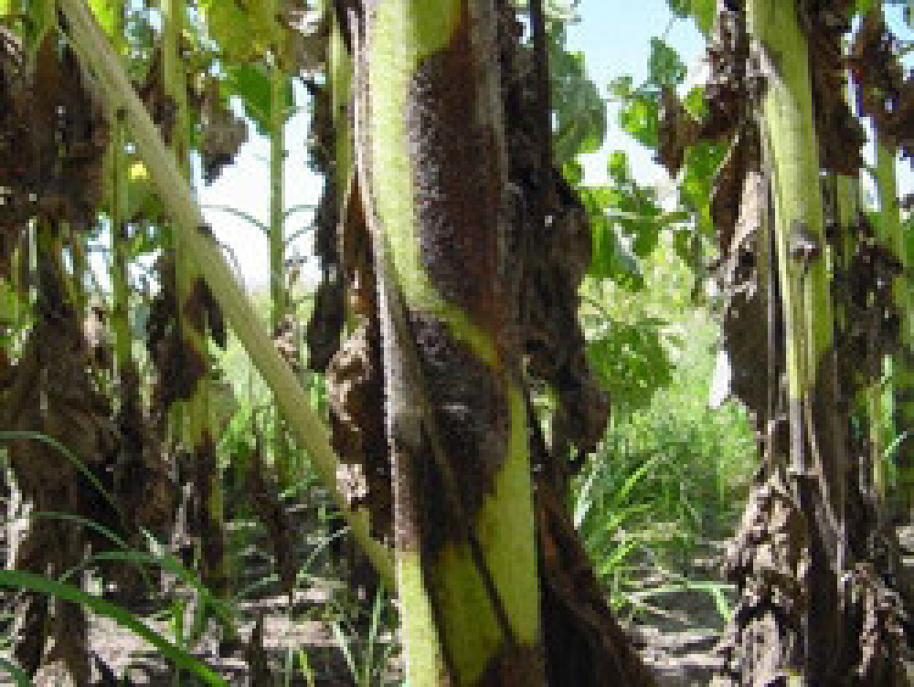 - На стеблях: Образуются темно-коричневые пятна в местах ответвления черенков. Пятна разрастаются и во время цветения сливаются, образуя сплошную черную полосу. Возбудитель распространяется в поверхностных тканях стебля, но иногда проникает в сосуды и сердцевину; часто наблюдается растрескивание пораженной ткани.