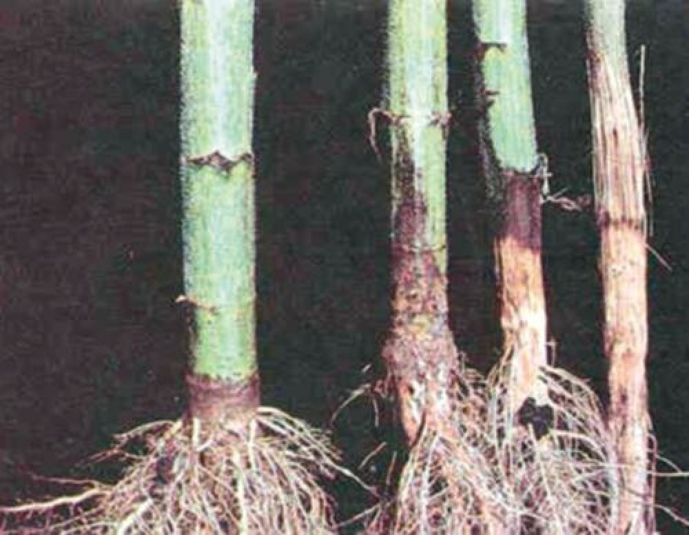 Болезнь проявляется на 2-3 нижних узлах и междоузлиях в виде бурых или соломенного цвета пятен различной формы. Во влажную погоду эти пятна покрываются красно-белым или розовым налетом. Стебель в местах поражения становится полым и размягчается. Подземные междоузлия и корни приобретают красный цвет, а сердцевина разрушается. При естественных условиях выделяют три типа поражения: некроз междоузлия (узлы остаются здоровыми), некроз узлов (междуузли остаются здоровыми), и некроз узлов и междоузлия.