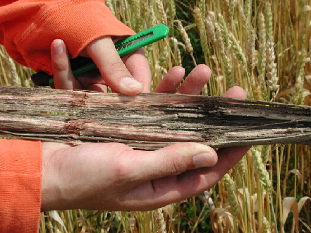 Первоначальные признаки включают преждевременное пожелтение листьев и появление белых пятен на междоузлиях. При вскрытии стебля можно заметить обесцвеченную или беловато-розовую сердцевину. Со временем пораженные участки становятся ветхими, высыхают, и в них формируются полости. Во влажные годы возможно формирование белого или бело-розового мицелия гриба на поверхности стебля.