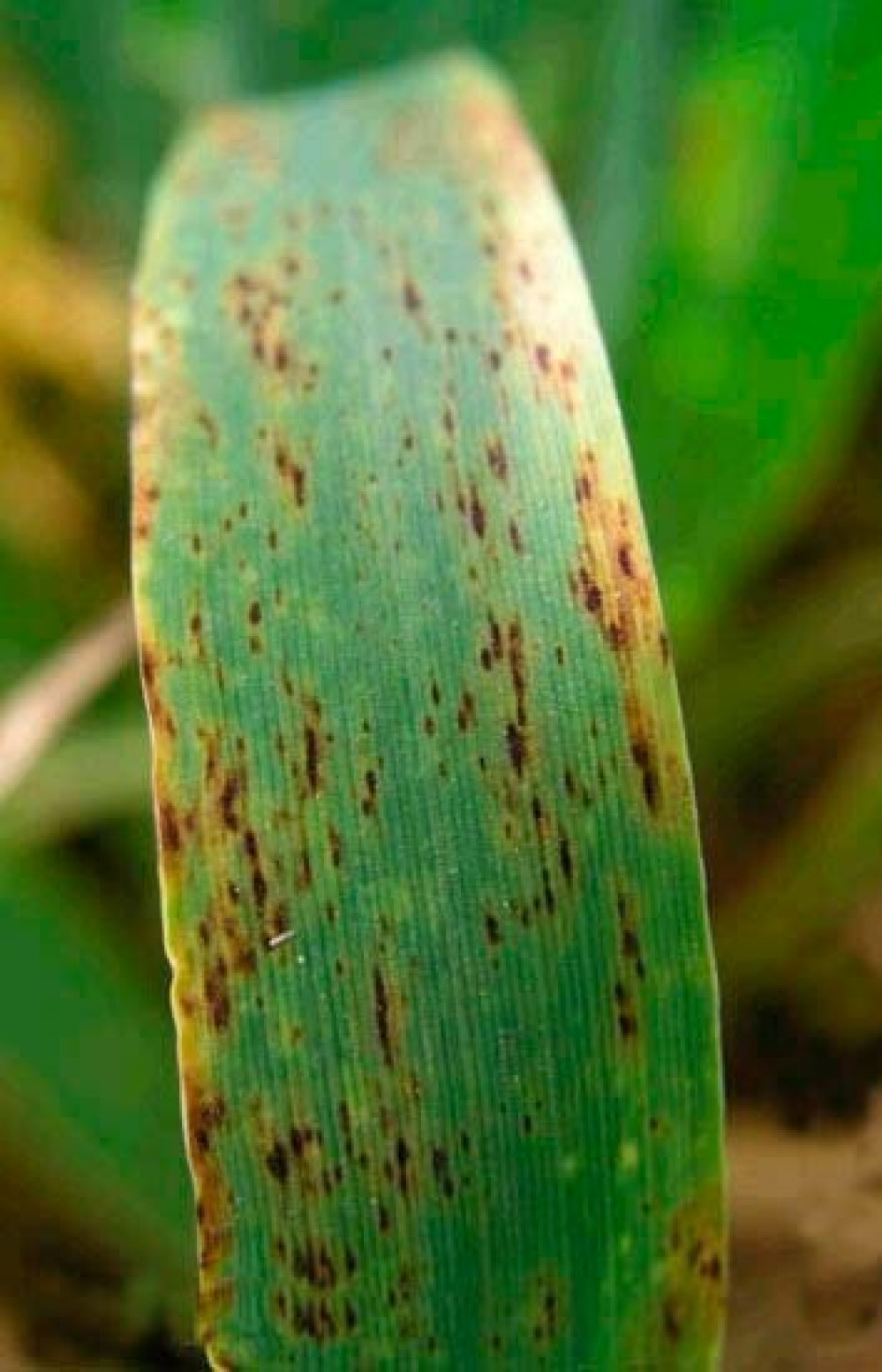 Гельминтоспориоз ячменя проявляется в виде бурых овальных пятен с многочисленными поперечными и продольными рисками, создающими узор сетки. Эти пятна не сливаются в отдельные продольные полосы. На пораженных участках образуется темно-серый налет конидиального спороношения. На зерновках появляются светло-бурые пятна с нежным сетчатым узором.
