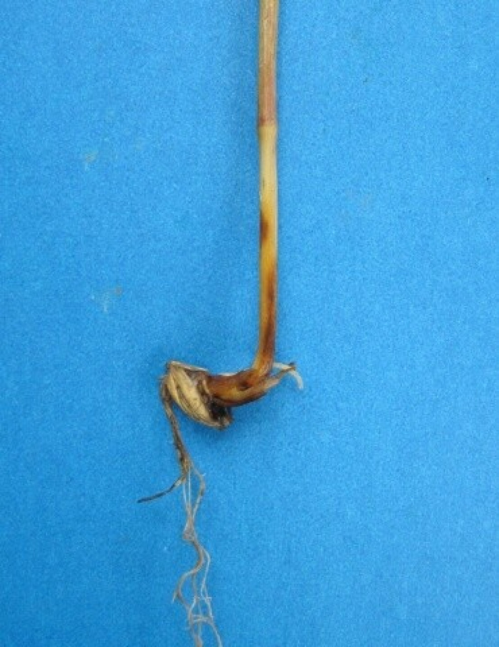 Темно-коричневые продолговатые язвы на первичных и вторичных корнях, а также на подземном междоузлии.