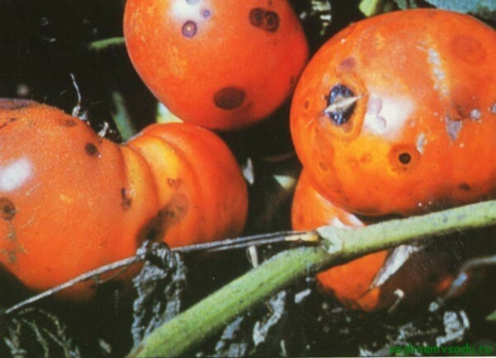 - Плоды: образуются вдавленные темно-бурые пятна, приводящие к гниению плода.