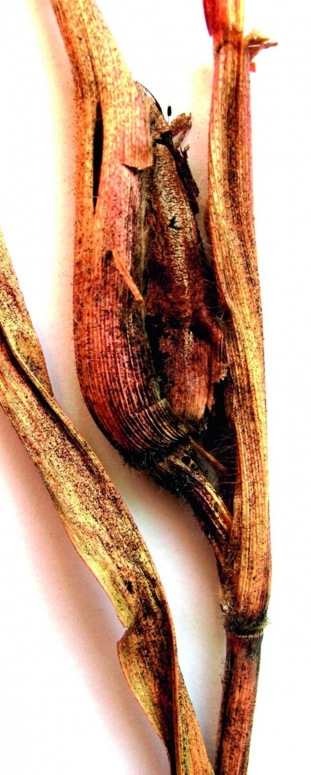 Головня (просо) распространена повсеместно и обнаруживается при выбрасывании метелок. Во влагалище верхнего листа метелки образуется продолговатое вздутие в виде желвака длиной 3-5 см. Сначала оно покрыто ржавой, а позже серовато-грязной тонкой пленкой, которая легко разрывается. Содержимое вздутия состоит из черно-бурой массы телиоспор и остатков осевых веточек соцветия.