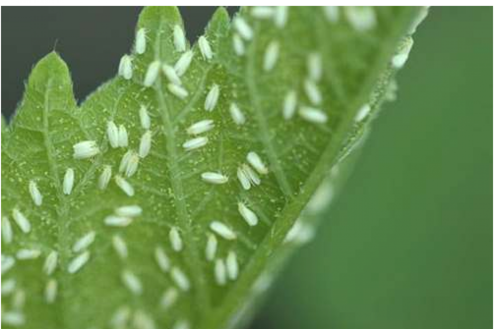 - Личинки: Прозрачные или зеленоватые, очень маленькие, прикрепляются к нижней стороне листьев.