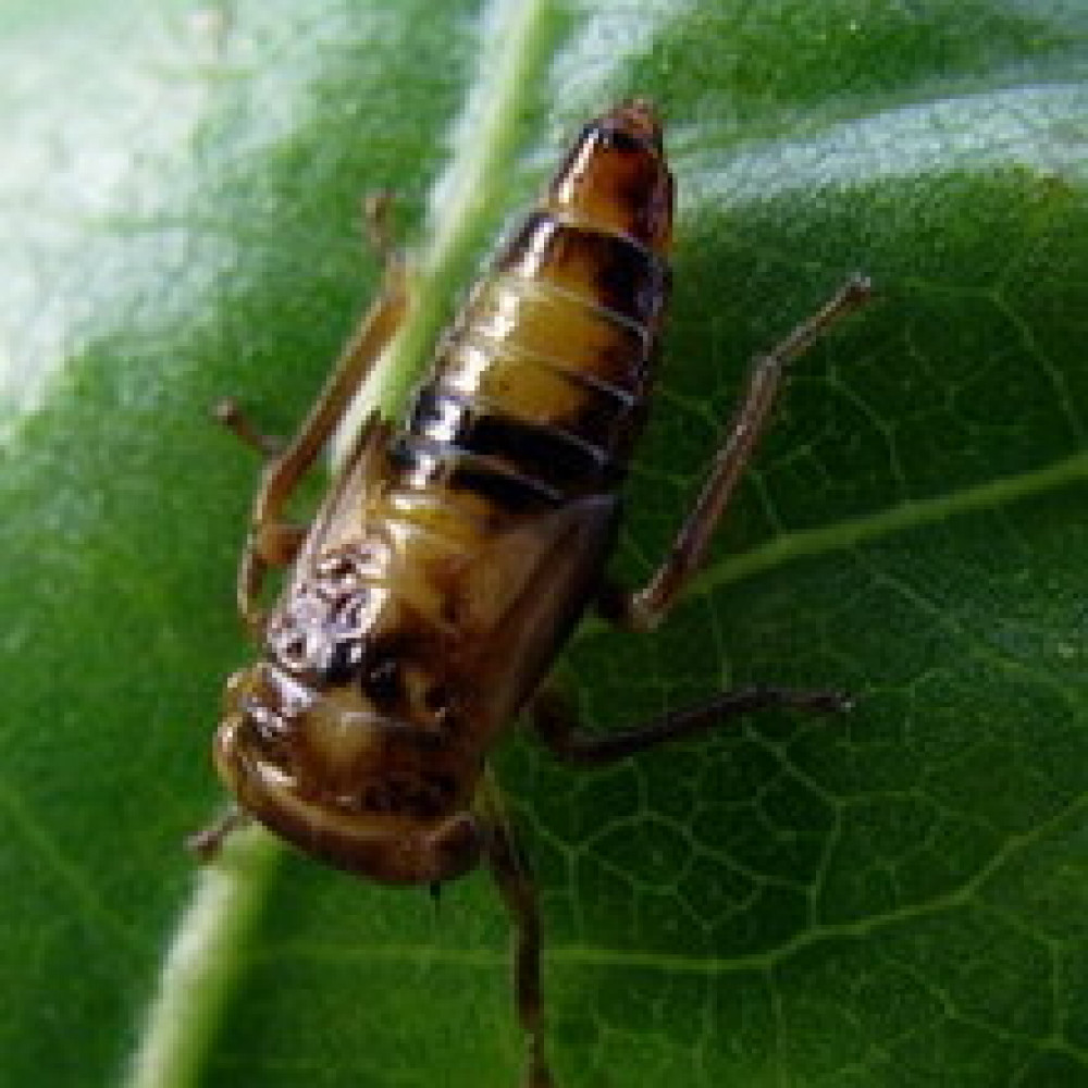 Взрослая особь имеет размер 6-9 мм, тело сплющено сверху вниз, голова короткая с округлым передним краем, переднеспинка широкая и короткая; щиток черный; крылья светло-серые, плоско сложенные, длиннее брюшка, которое является коротким и сплющенным; задние ноги приспособлены для прыжков. Яйцо размером 0,6 мм, белое, с блестящей поверхностью. Личинка длиной 7-10 мм, светло-коричневая, передняя часть тела немного более темная.