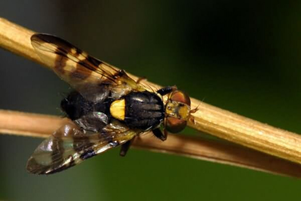 - Внешний вид: Муха имеет длину от 4 до 5,3 мм, темнобурая со светлооранжевой головой и грудью, желтые полосы на спине. Крылья прозрачные с темными полосами.